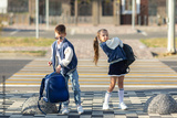 Tired sad little boy and girl, friends, both school children walk home after lessons, carrying heavy backpacks filled with textbooks. End of the school day and the hard work of learning concept.