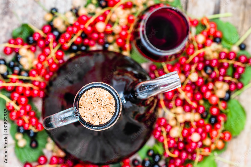 Fruit liquor in a bottle and glass of sweet alcohol on wooden table