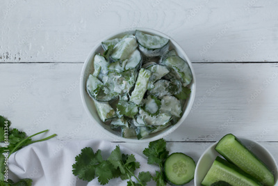 Cucumber salad with yogurt dressing on the white background