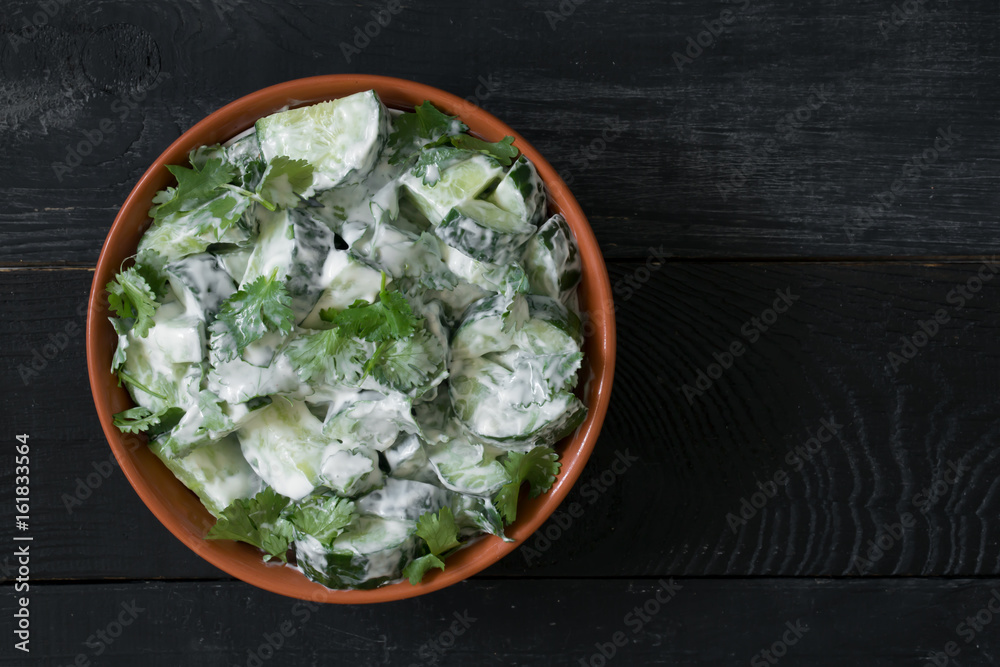 Cucumber salad with yogurt dressing on the black wooden background with copy space