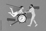 Pop zine full art photo collage of two happy girl guy business partners stand alarm clock deadline limit expire arrow development