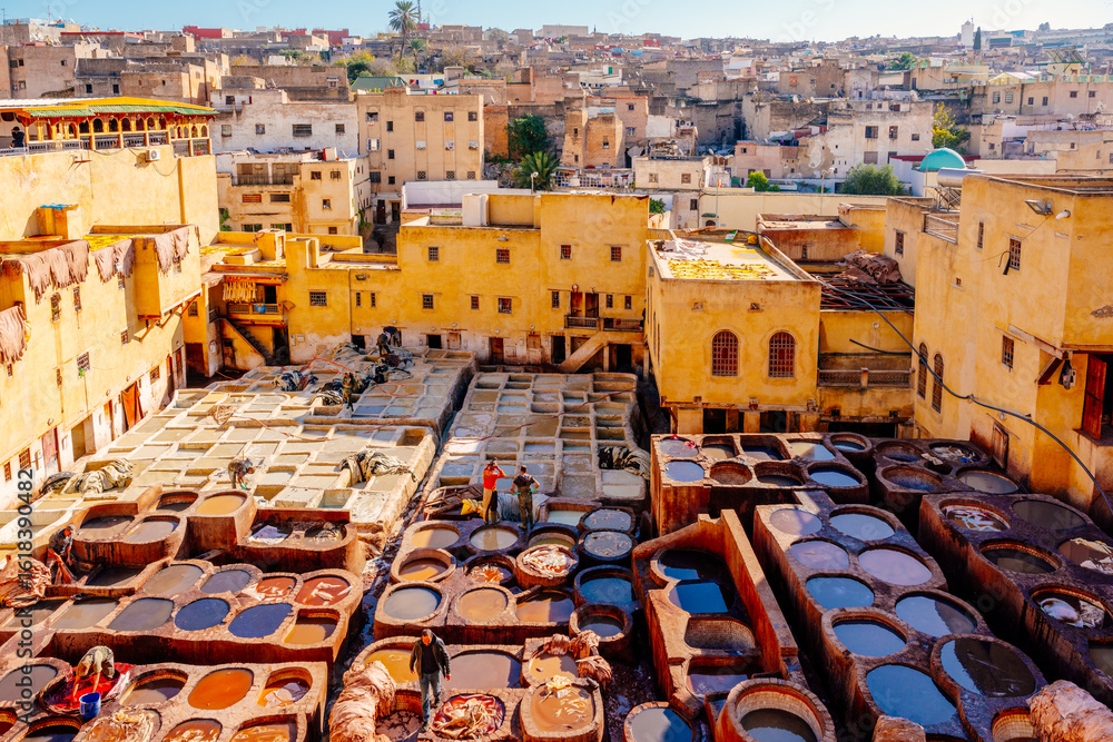 Fez, Morocco: Workers dye leather in traditional tanneries, a centuries-old process, amid the city's ancient medina..