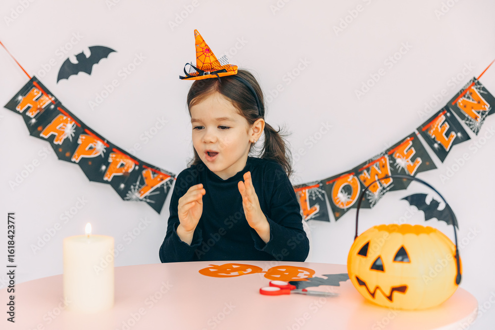 Little adorable cute Caucasian girl with curly hair playing and blowing candle with fun and amusement, celebrating Halloween party at home on decorated background. Kids Activity Concept