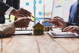 Real estate agent calculates property value with customer, discussing investment potential surrounded by paperwork. Consultation on buying, selling, or renting.