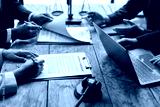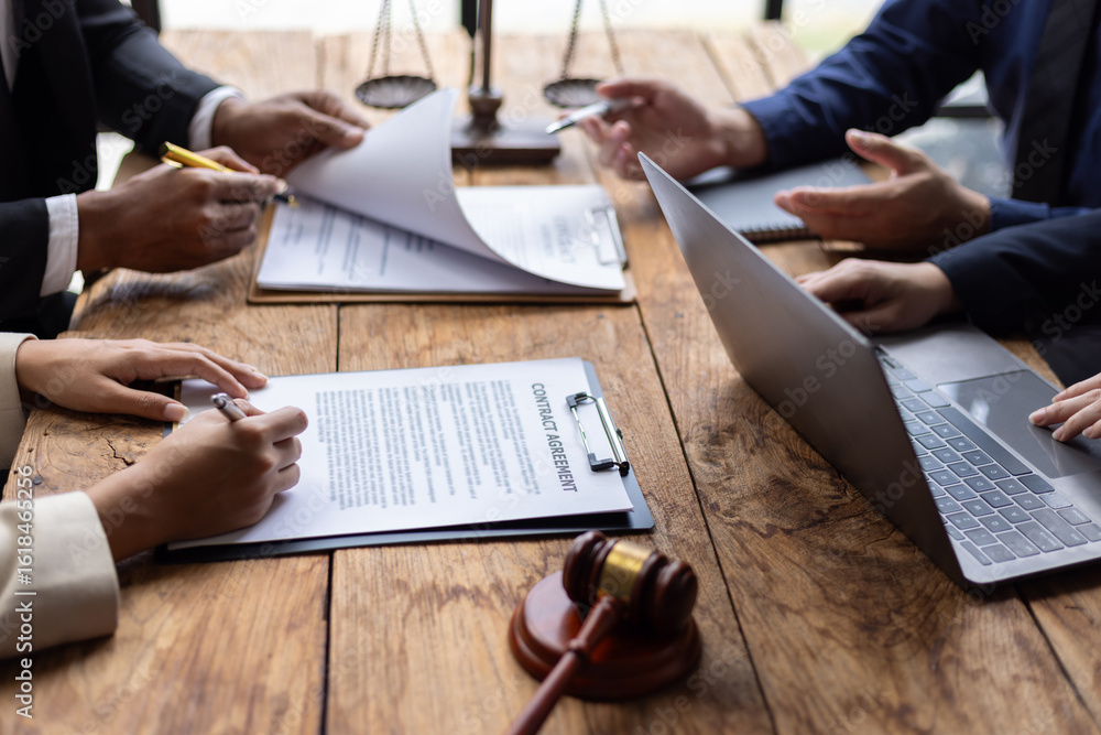 Lawyers and clients reviewing contract agreement terms before signing. Business partners carefully review contract terms before signing at a wooden table.