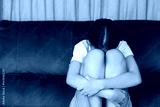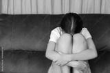 Sad, lonely girl hugging her knees on a sofa. Depression, anxiety, and mental health concept. Unhappy, depressed teenager feeling stress and solitude at home.