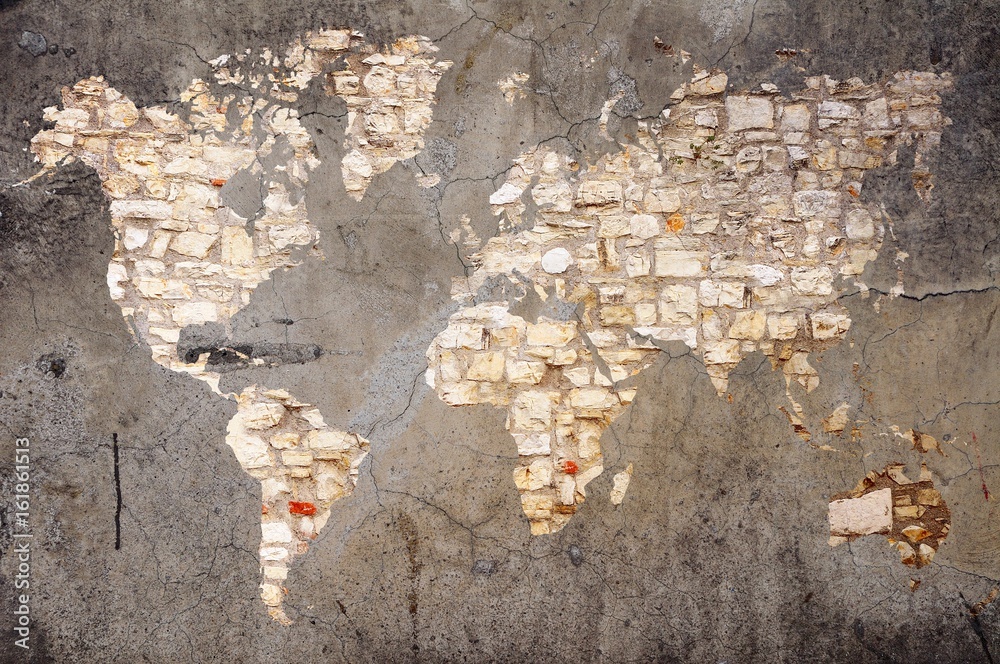 Stone world map on cracked wall background. Elements of this image furnished by NASA.