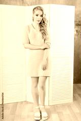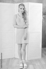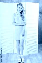 Young and emotional girl in fashion blue dress over glamour background. Kid's and fun