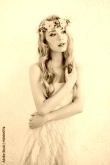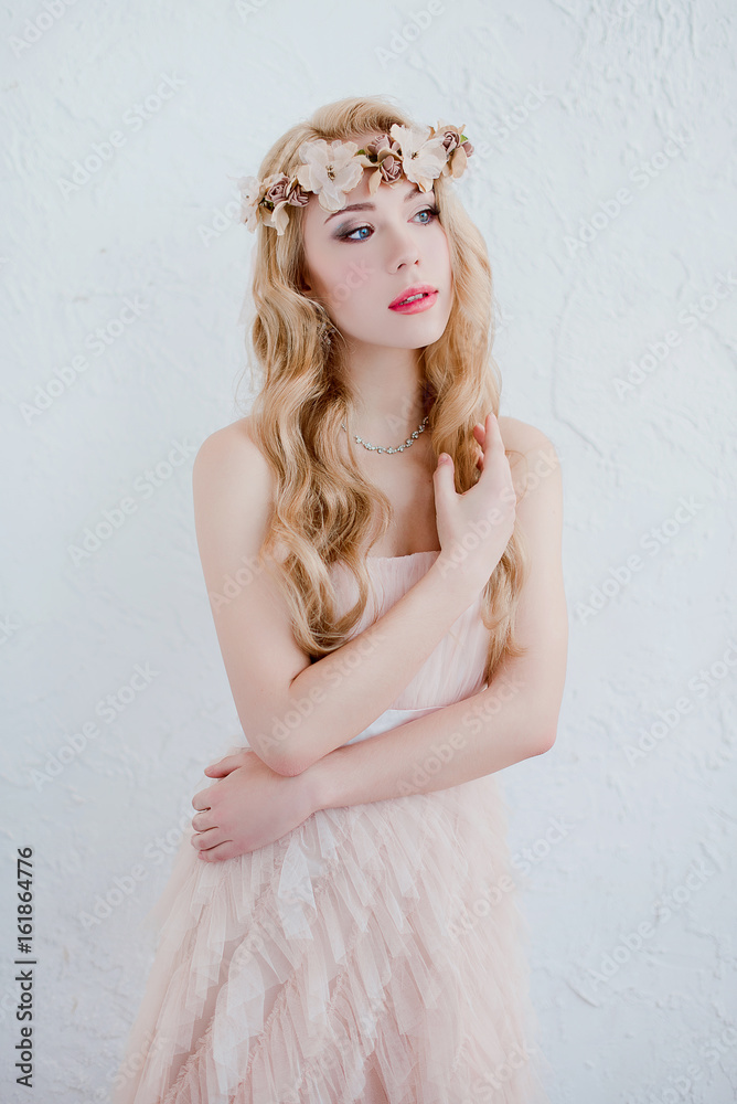 picture of young blonde woman wearing wreath of flowers, spring tender and romantic portrait, fashion retouched shot