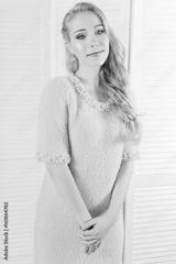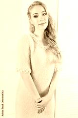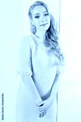 Young and emotional girl in fashion blue dress over glamour background. Kid's and fun