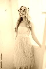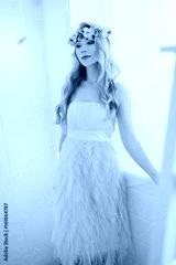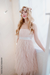 picture of young blonde woman wearing wreath of flowers, spring tender and romantic portrait, fashion retouched shot