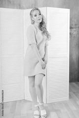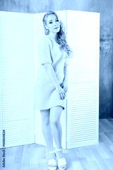 Young and emotional girl in fashion blue dress over glamour background. Kid's and fun