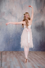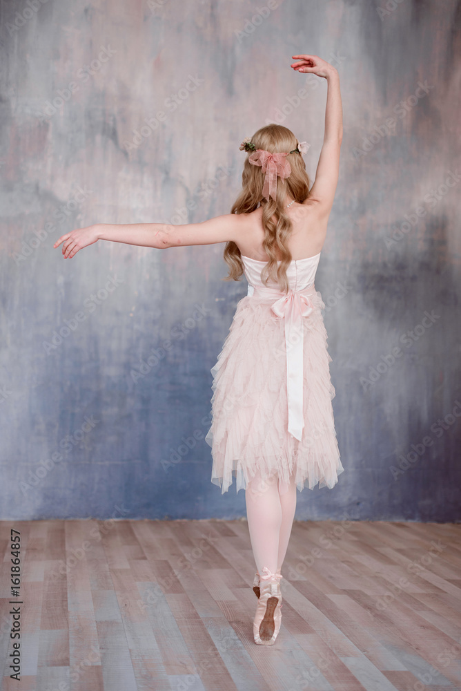 Beautiful legs of young ballerina dancing at white wooden floor background, with copy space. Ballet practice. Beautiful slim graceful ballet dancer. Spring and romantic atmosphere