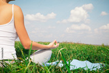 Young girl doing yoga lotus pose in the park over blue sky