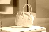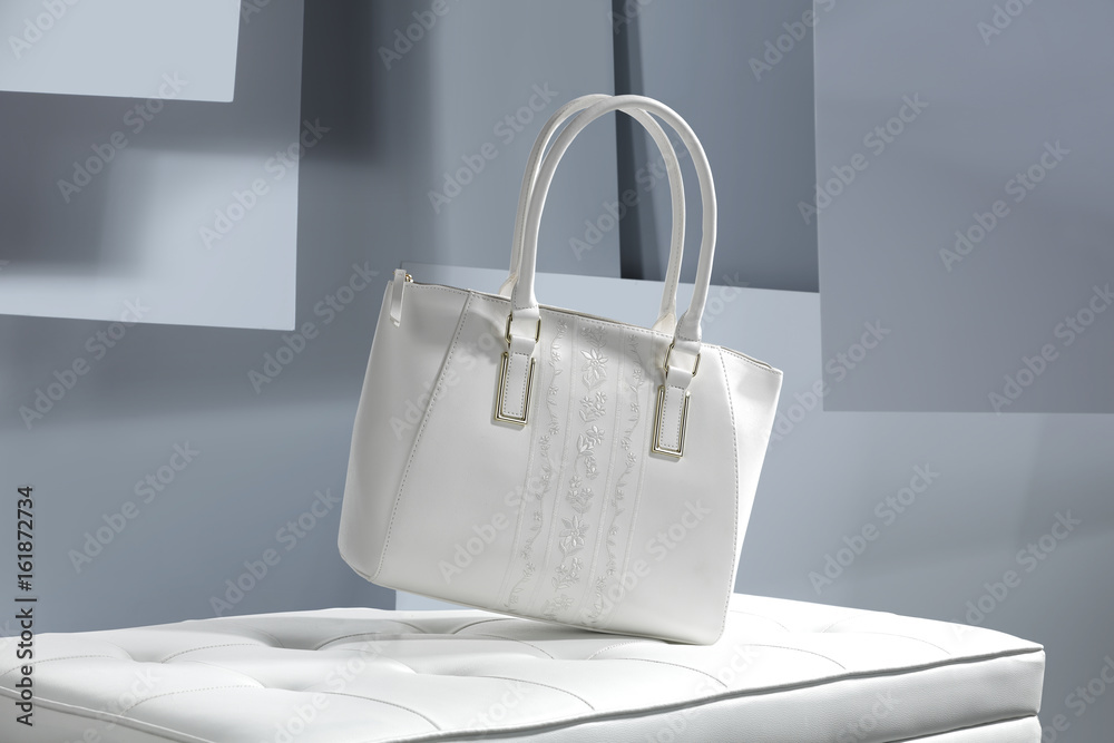 A large white women's shopping bag on a white pouf and a bright wall in the interior.