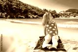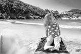 Girl in a swimsuit sitting and playing on the beach with the sea and a sandy beach in the background.
