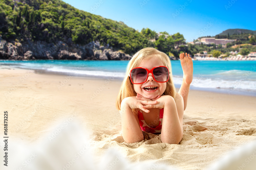 A girl in a swimsuit and red summer sunglasses playing and lying on the beach with the sea and a sandy beach in the background.
