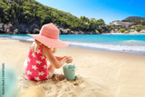 Girl in a swimsuit playing on the beach making sandcastles with the sea and rocky mountains and a sandy beach in the background.