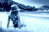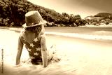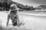 Girl in a swimsuit in a summer hat sitting and playing on the beach with the sea and a sandy beach in the background.