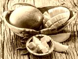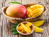 Mango fruits with green leaf and mango cut in hedgehog style on wooden table.