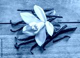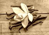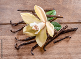 Yellow moth orchid flower and vanilla sticks on wooden table.