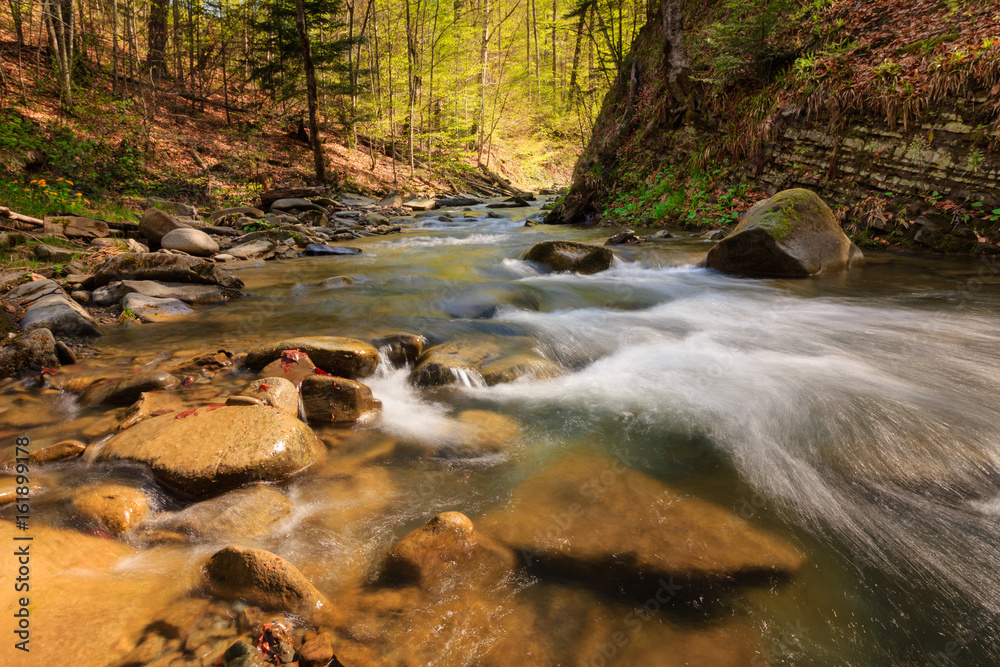 View of mountain river with small waterfall and rapids at sunny day. Big mossy stones and boulders on river bank. Fast jet of water at slow shutter speeds give a beautiful magic effect.