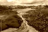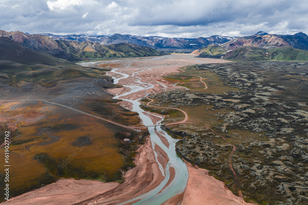 Aerial view of a winding river in Iceland's colorful Landmannalaugar region, with volcanic rock formations, snow capped mountains, and a partly cloudy sky.