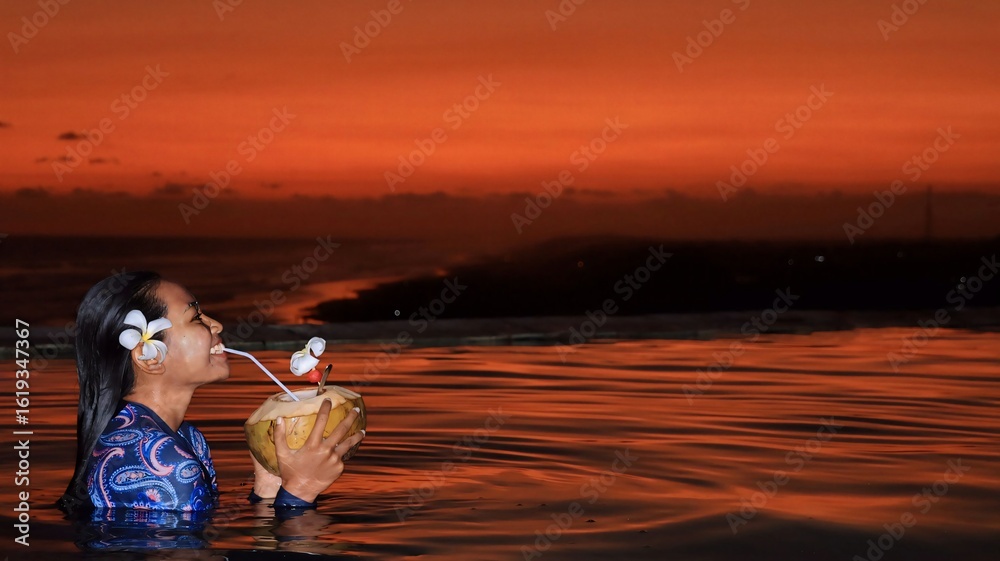 Happy Woman in Infinity Pool Holding Coconut Drink at Tropical Sunset