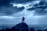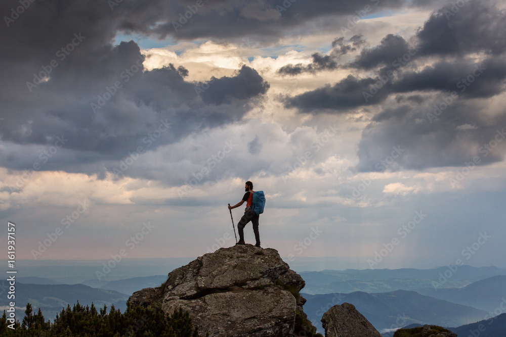 Trekker hiking on a mountain with beautiful storm clouds in background