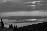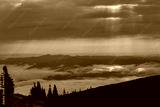 Beautiful sunrise over mountains with storm clouds in background. Masivul Ceahlau, Romania.