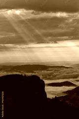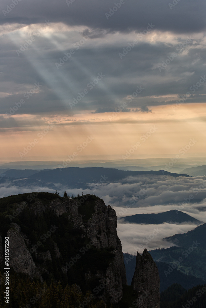 Beautiful sunrise over mountains with storm clouds in background. Masivul Ceahlau, Romania.
