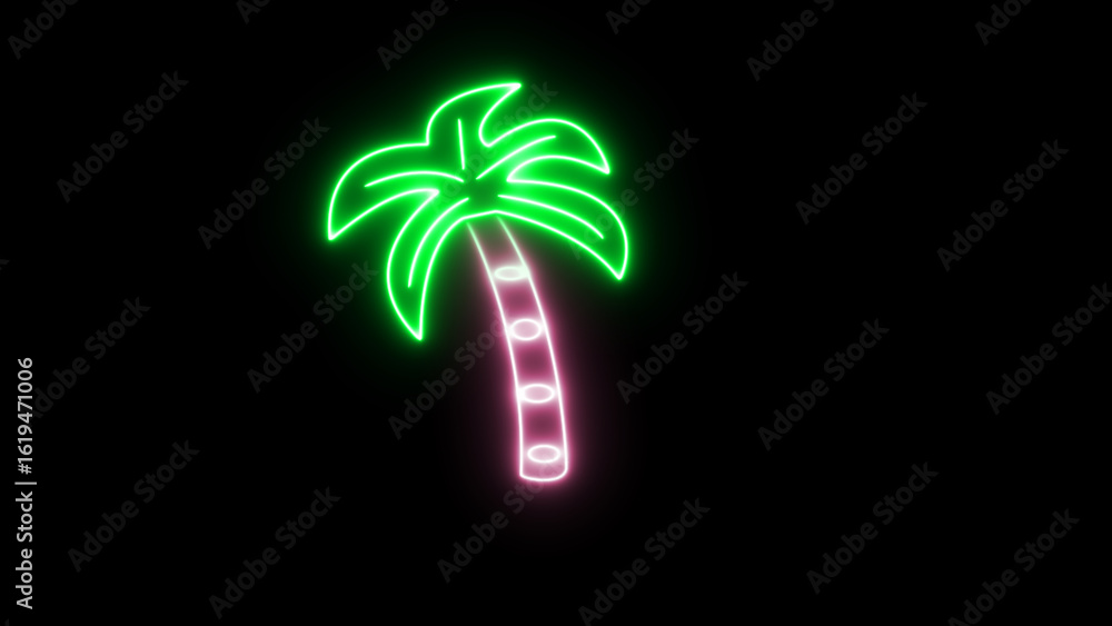 Glowing neon palm tree symbol of paradise evokes a playful tropical getaway at night on a black