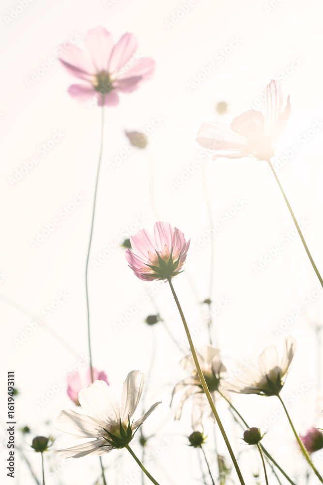 Dreamy vertical garden scene showing cosmos flowers under a sun-filled luminous sky