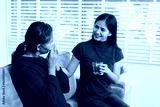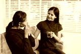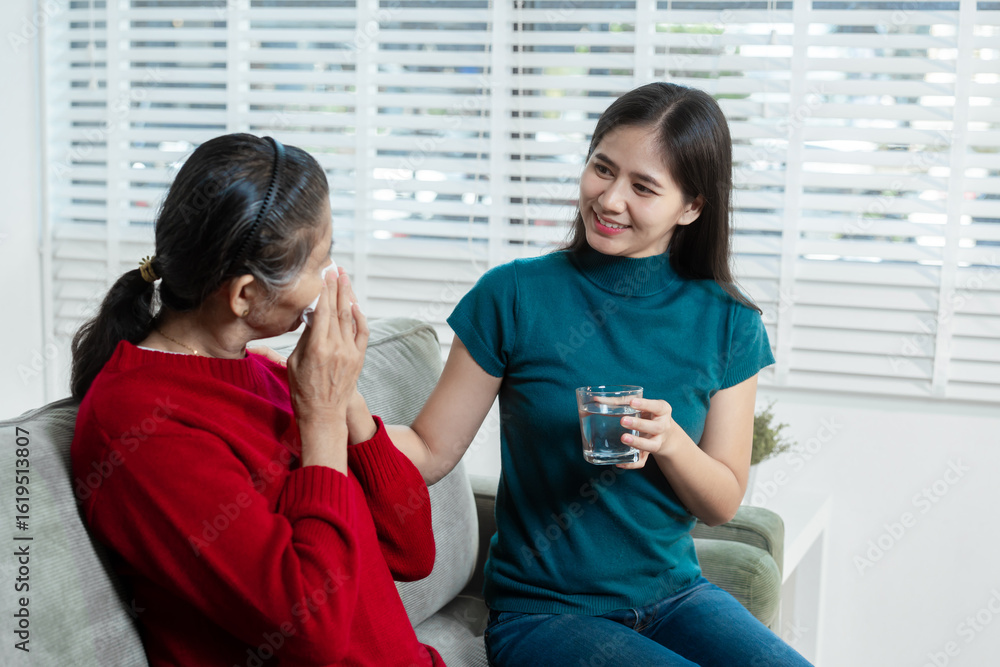 An Asian young woman carefully cares for her ill mother at home, sitting on the sofa, offering medication and water, providing compassionate support and attentive care in a peaceful living room