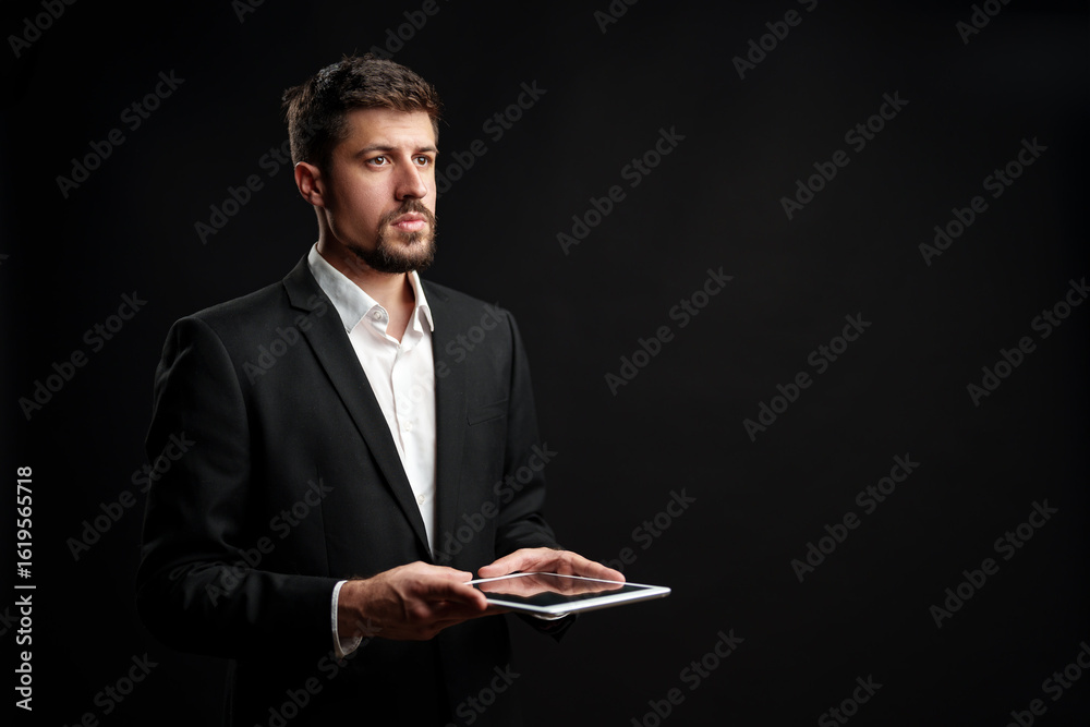 Business professional holding a tablet and looking thoughtfully in a studio setting with a dark background
