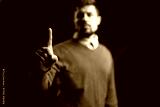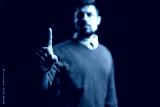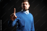 Man in blue sweater gestures with raised finger against dark background conveying a message of pause or warning