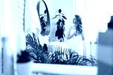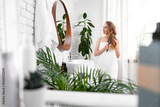Woman combing hair in a bright bathroom surrounded by plants and natural light during daytime