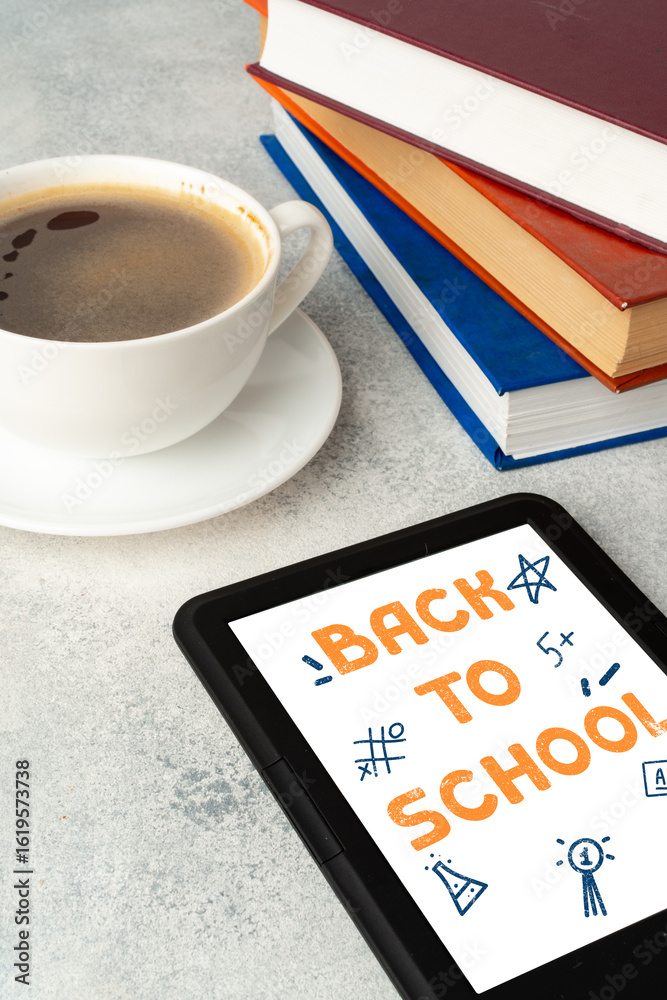 Coffee, books, and a tablet showing back to school preparations on a workspace