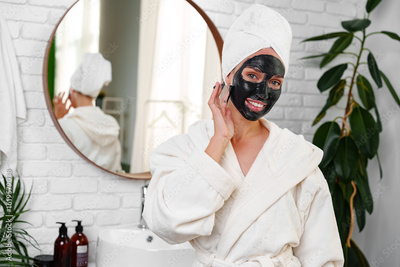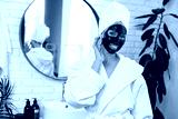 Woman applies facial mask while preparing for self-care routine in modern bathroom setting