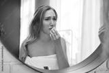Woman removing makeup in front of mirror after long day, expressing emotions in a bright bathroom setting