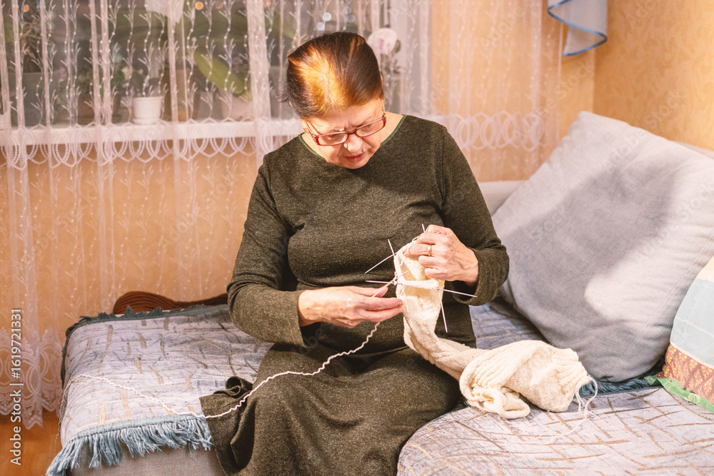 A focused elderly woman wearing glasses intently knits a warm, handcrafted item with white yarn, enjoying her peaceful hobby in a cozy home interior with lace curtains by a window.