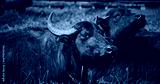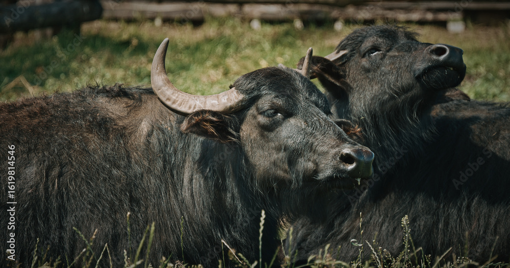 Two Black Water Buffalos Resting Peacefully in a Serene Green Field