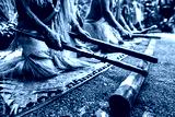 Hands of warriors from Futuna, Vanuatu, beat a bamboo log in time during a customary dance. Dressed in woven pandanus attire, they celebrate their cultural heritage.