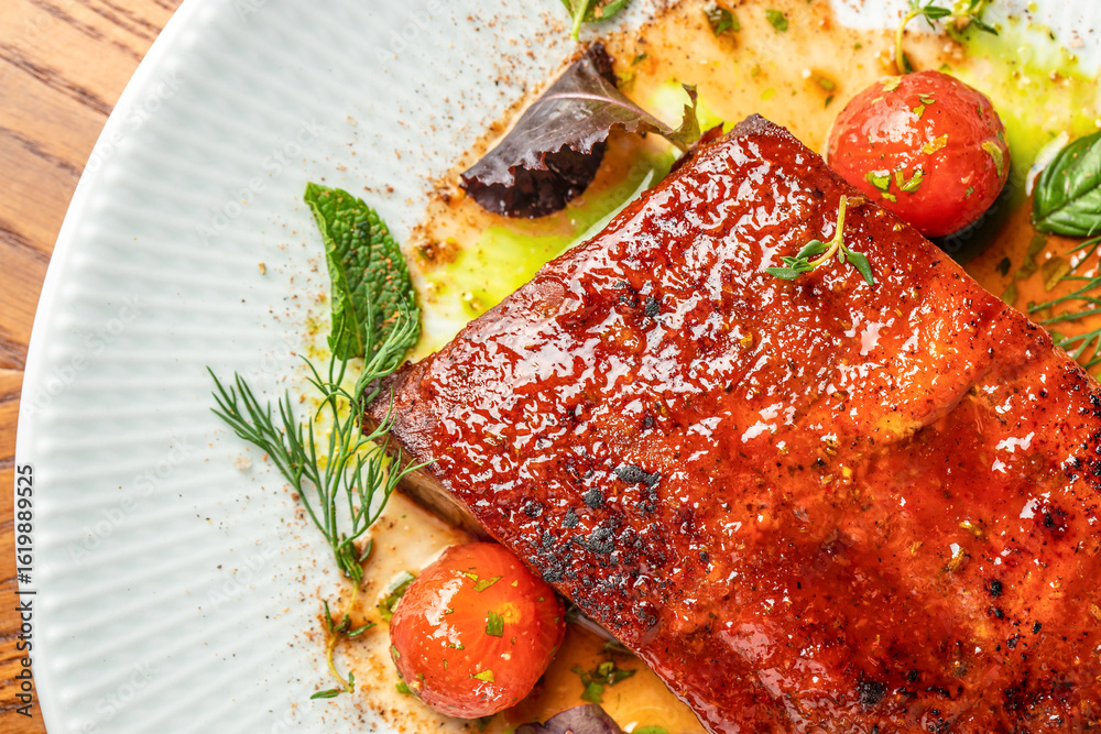 Juicy glazed grilled salmon fillet served with cherry tomatoes, fresh herbs, and vibrant sauce on a textured white plate. top view. copy space