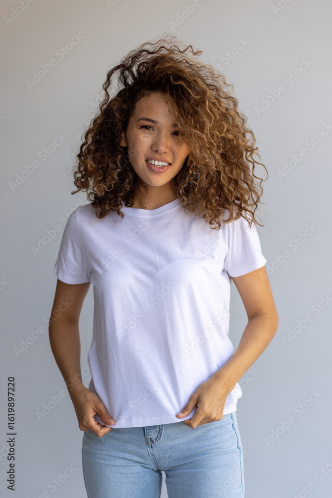 Beautiful Curly Woman Posing In White T-Shirt And Blue Jeans On Gray Background