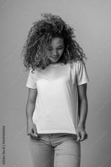 Young Woman In Plain White T-Shirt And Jeans Posing On Gray Background