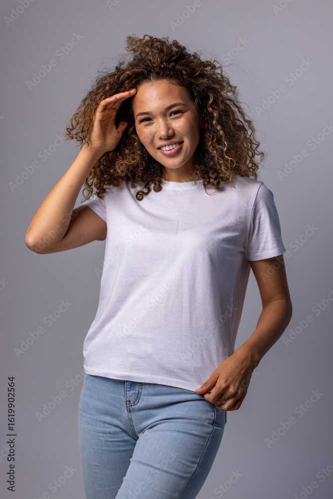 Young Woman In Plain White T-Shirt And Jeans Posing On Gray Background