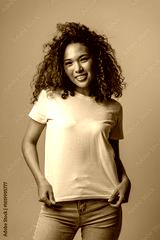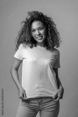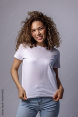 Young Woman In Plain White T-Shirt And Jeans Posing On Gray Background