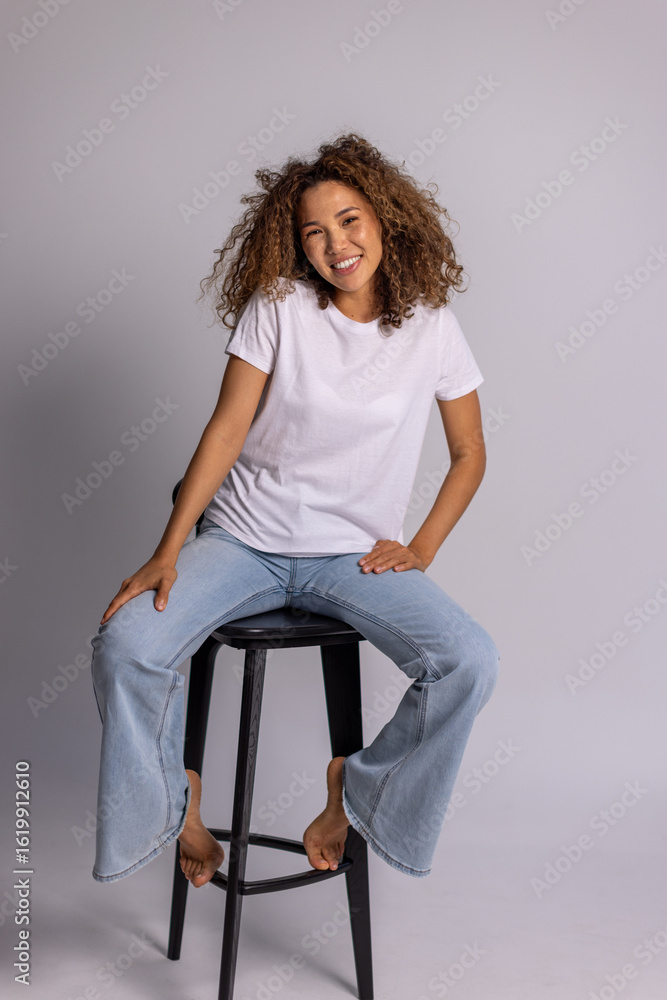 Curly Woman Sitting On Stool In White T-Shirt And Blue Jeans