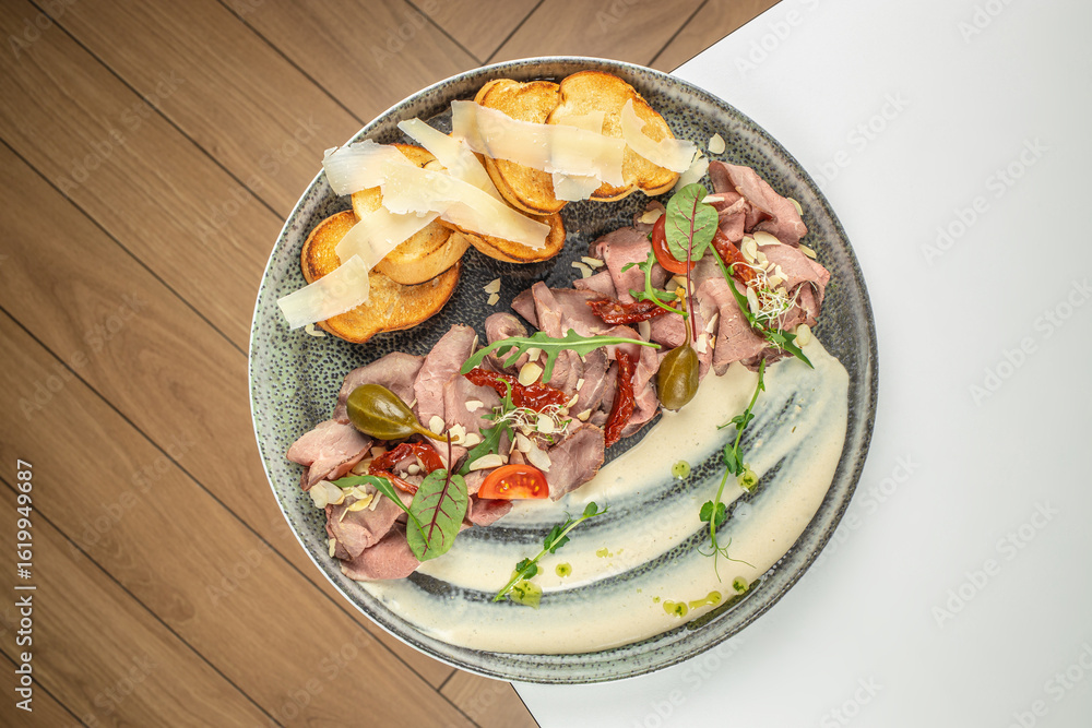 Gourmet beef carpaccio served with creamy sauce, toasted baguette slices, shaved cheese, caper berries, and microgreens on a ceramic plate. top view, copy space